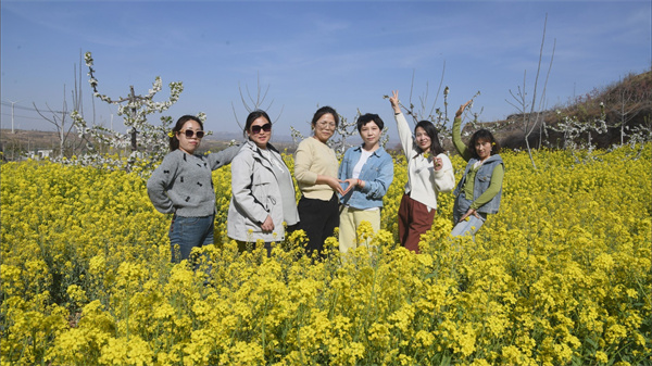 4月6日,山西省运城市闻喜县河底镇下庄村的采摘生态园内,油桃花红、樱桃花粉、油菜花香,吸引游客结伴前来踏青赏景、拍照打卡。